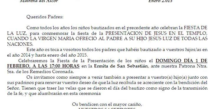 A este acto son invitados todos los niños bautizados en nuestra localidad desde Febrero de 2014 hasta Enero de 2015, junto con sus familiares. En él se realiza la presentación de los pequeños ante su Madre y Patrona la Santísima Virgen de los Remedios Coronada.