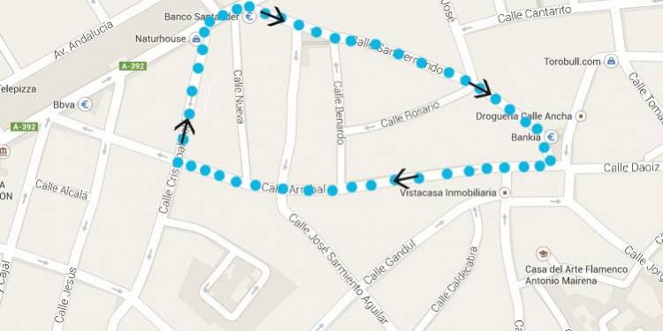 La hermandad recorrerá las mismas calles por las que viene procesionando tradicionalmente en los últimos años con la novedad de que lo hará en sentido contrario, quedando el recorrido de la siguiente forma: Salida de la Ermita, San Fernando, Plaza de Antonio Mairena, Arrabal, Cristobal Colón, Avda. de Andalucía, San Fernando y Plaza de San Sebastián.