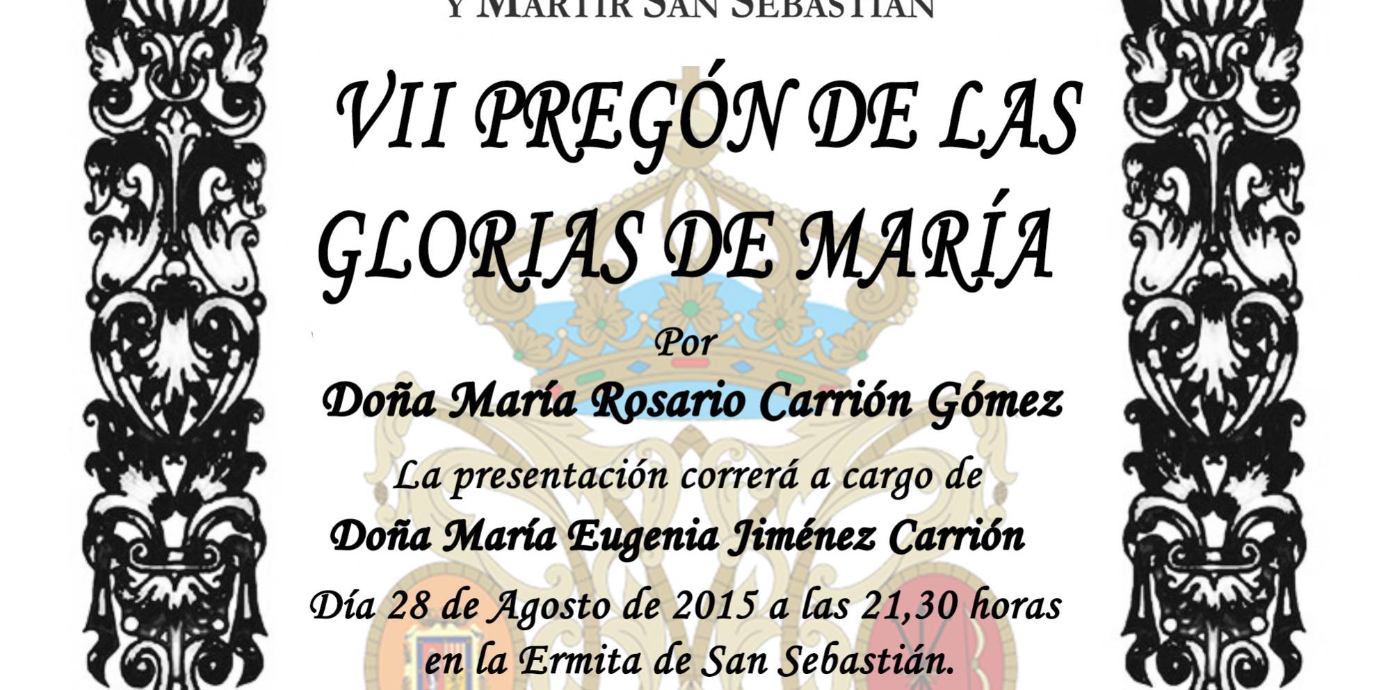 El VI Pregón de las Glorias de María que organiza nuestra Hermandad como pistoletazo de salida a las Fiestas Patronales en honor de Nuestra Señora de los Remedios Coronada tendrá lugar el próximo Viernes 28 de Agosto de 2015 a las 21,30 horas en la Ermita del Glorioso Mártir San Sebastían.